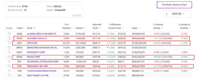 著名投资东谈主、巴菲特“价值投资”跟班者段永平最新捏仓情况曝光:大幅增捏AI股谷歌和英伟达,加仓苹果、拼多多,减捏阿里巴巴、微软等。